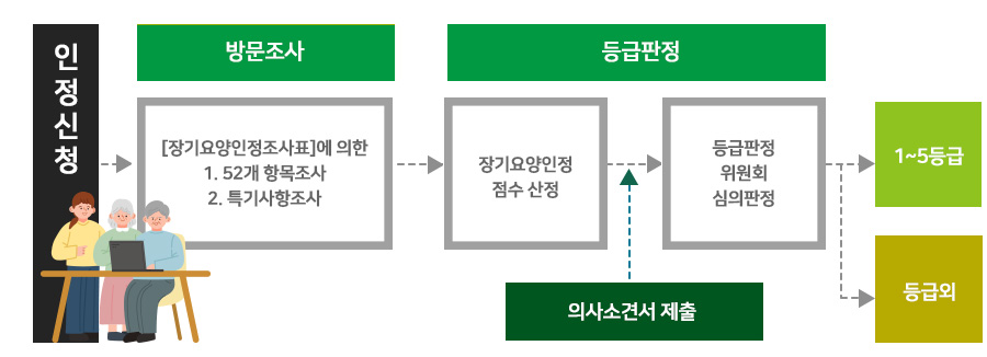 등급판정위원회는 방문조사 결과, 의사소견서, 특기사항 등을 기초로 신청인의 기능상태 및 장기요양이 필요한 정도 등을 등급판정 기준에 따라 다음과 같이 심의 및 판정합니다.
