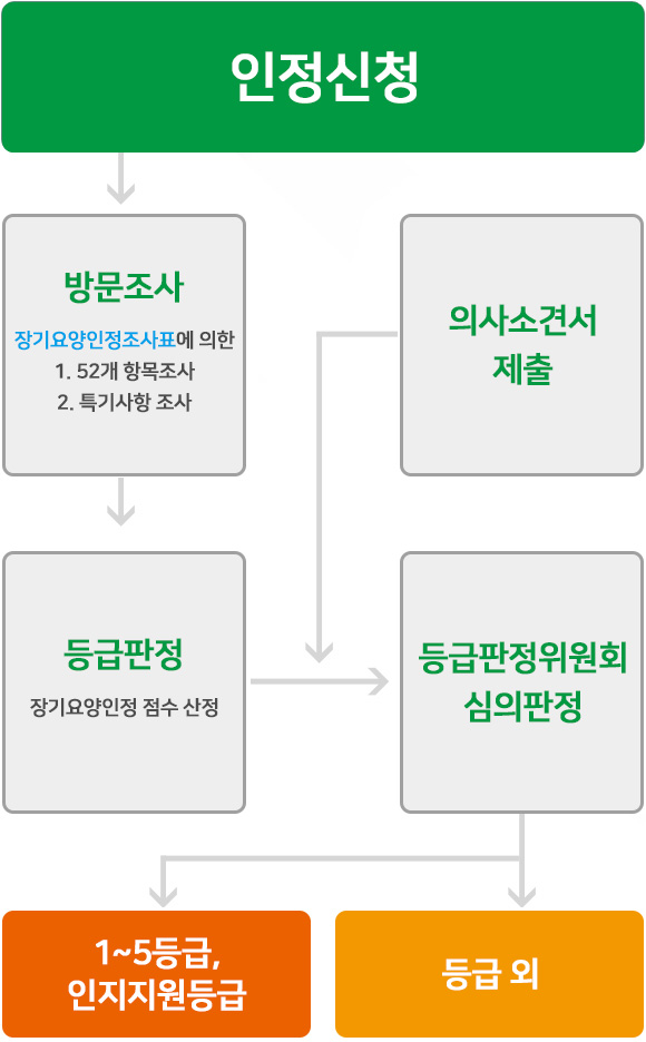 등급판정은 "건강이 매우 안좋다", "큰 병에 걸렸다." 등과 같은 주관적인 개념이 아닌 "심신의 기능상태에 따라 일상생활에서 도움(장기요양)이 얼마나 필요한가?"를 지표화한 장기요양인정점수를 기준으로 합니다. 장기요양인정점수를 기준으로 다음과 같은 6개 등급으로 등급판정을 합니다.